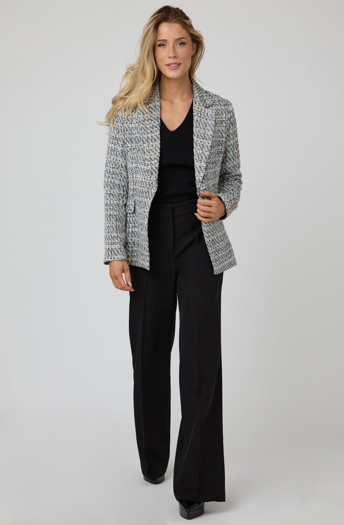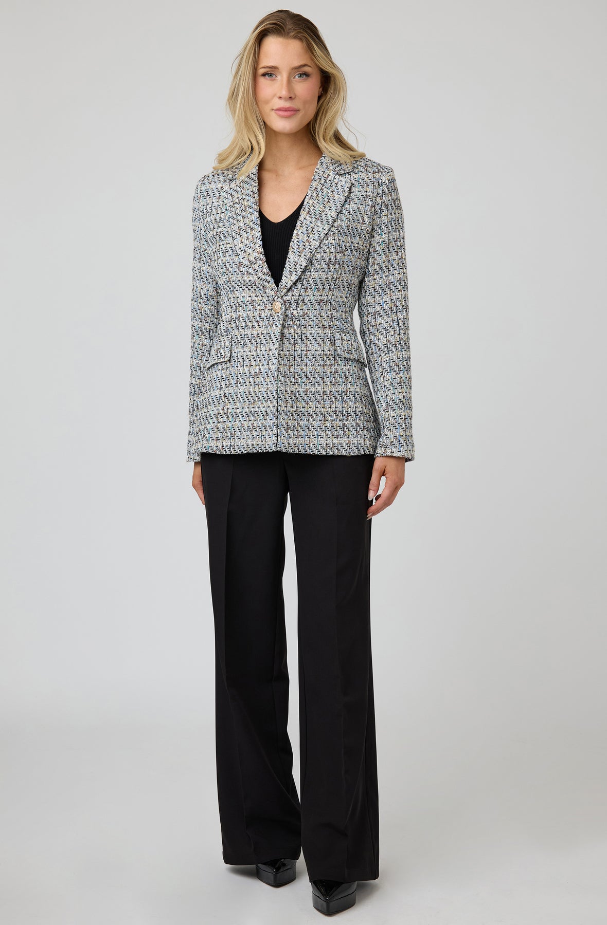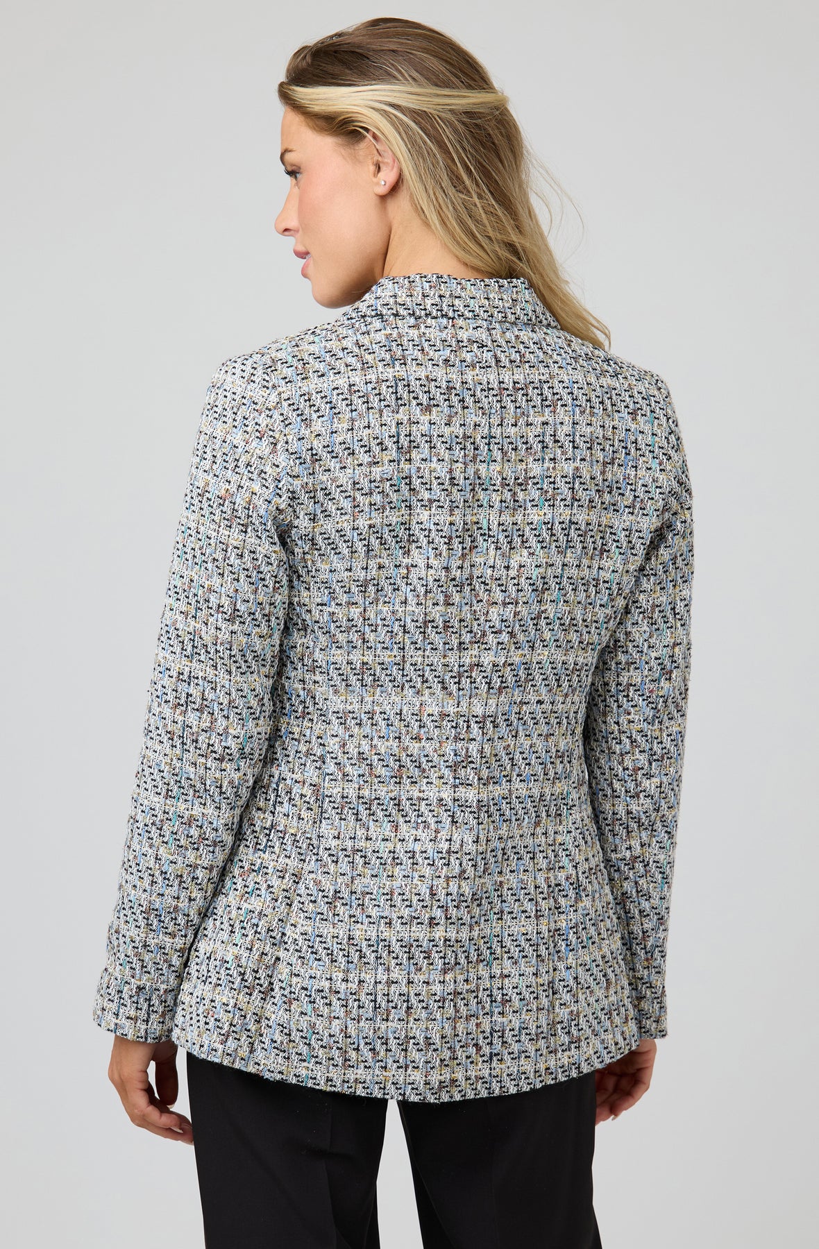 This single-breasted tweed blazer brings timeless sophistication to any wardrobe. Crafted from a rich textured weave with subtle gold metallic threads, it features structured shoulders, flap pockets, and a slim cut that flatters the silhouette. Fully lined for comfort, it pairs effortlessly with dress pants, skirts, or denim for an elevated, polished look.
