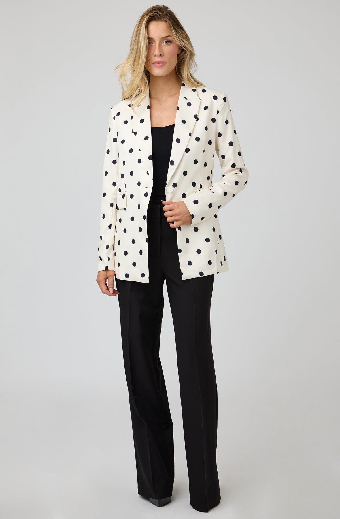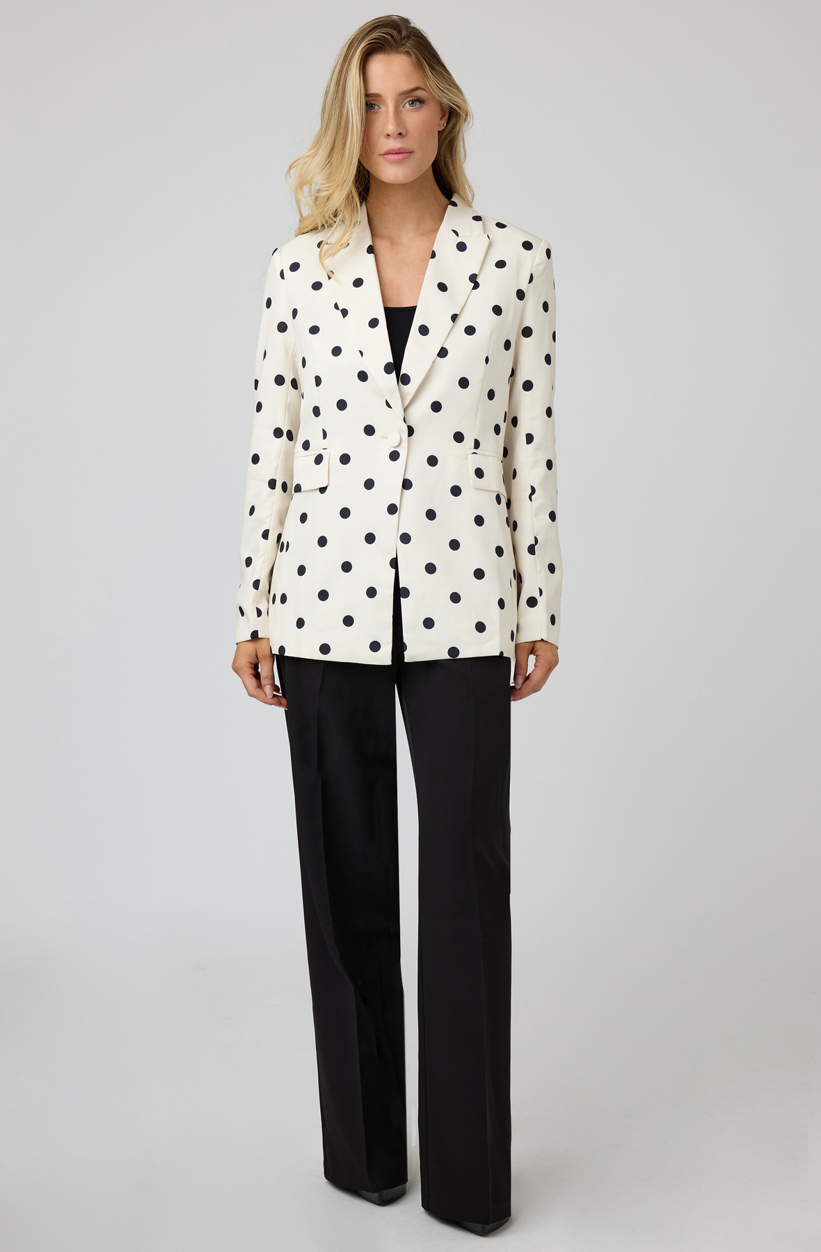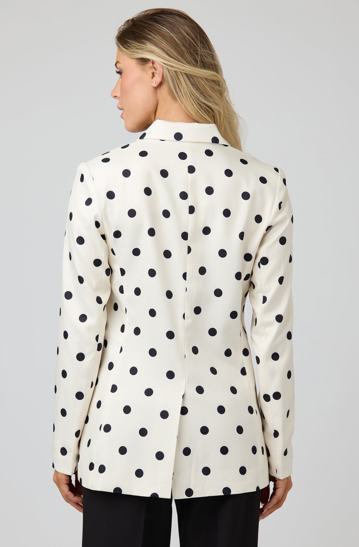 Playful yet refined, this polka dot satin blazer adds instant personality to any look. Designed with a single-breasted silhouette, structured shoulders, and flap pockets, it offers a sleek, modern fit with a hint of stretch for comfort. Fully lined for a smooth finish — perfect for pairing with solid trousers, denim, or matching separates for a standout statement.