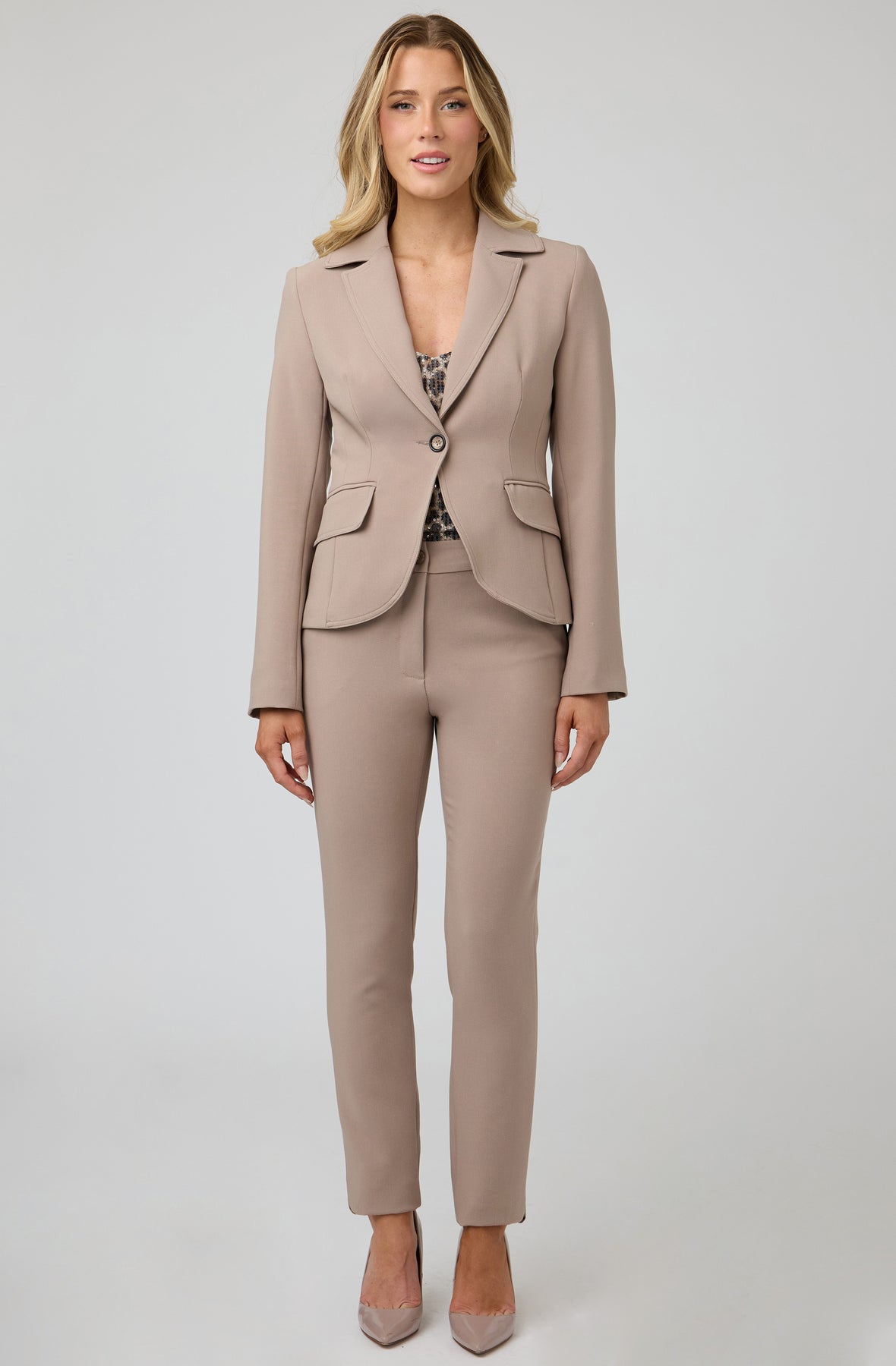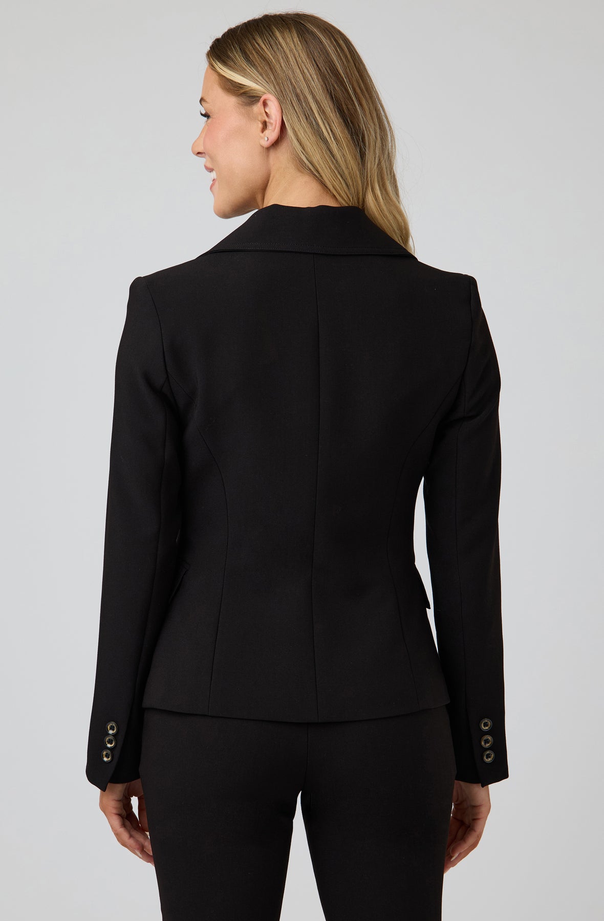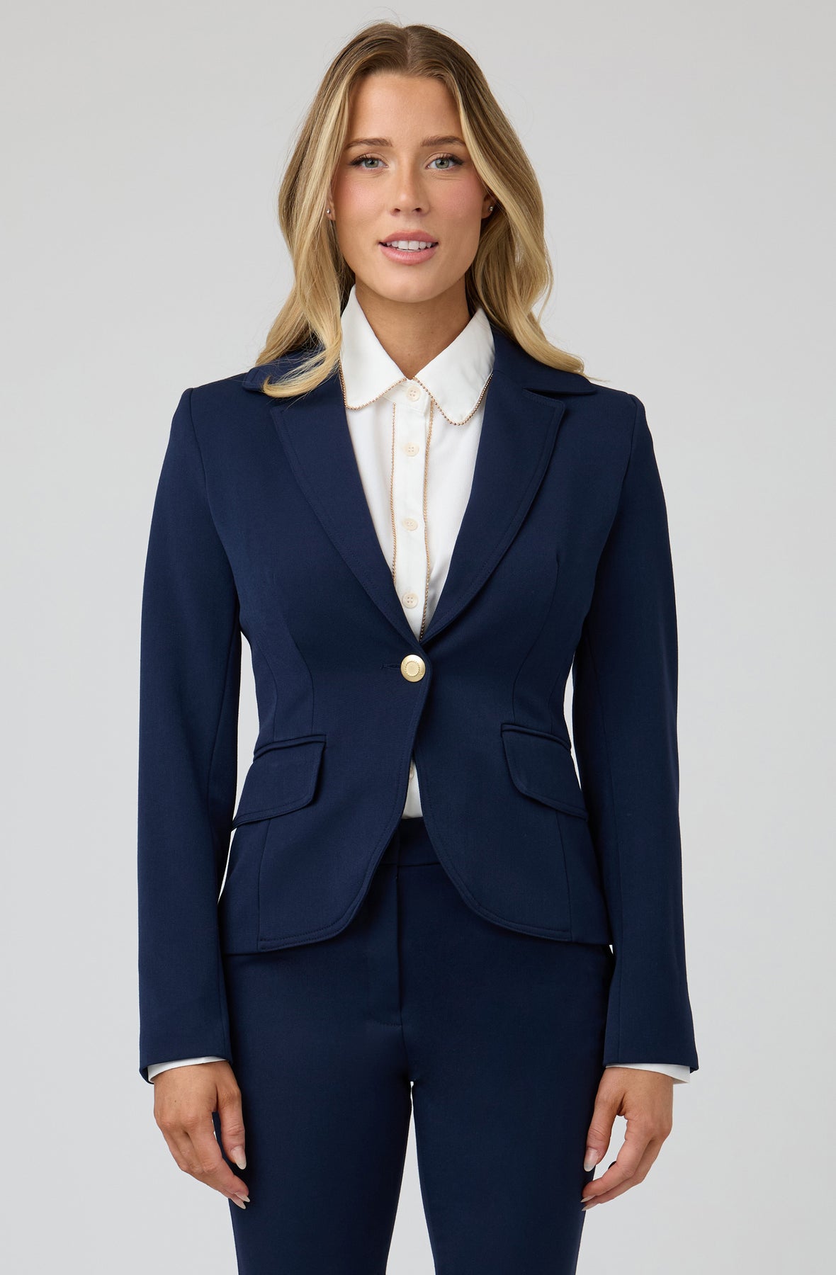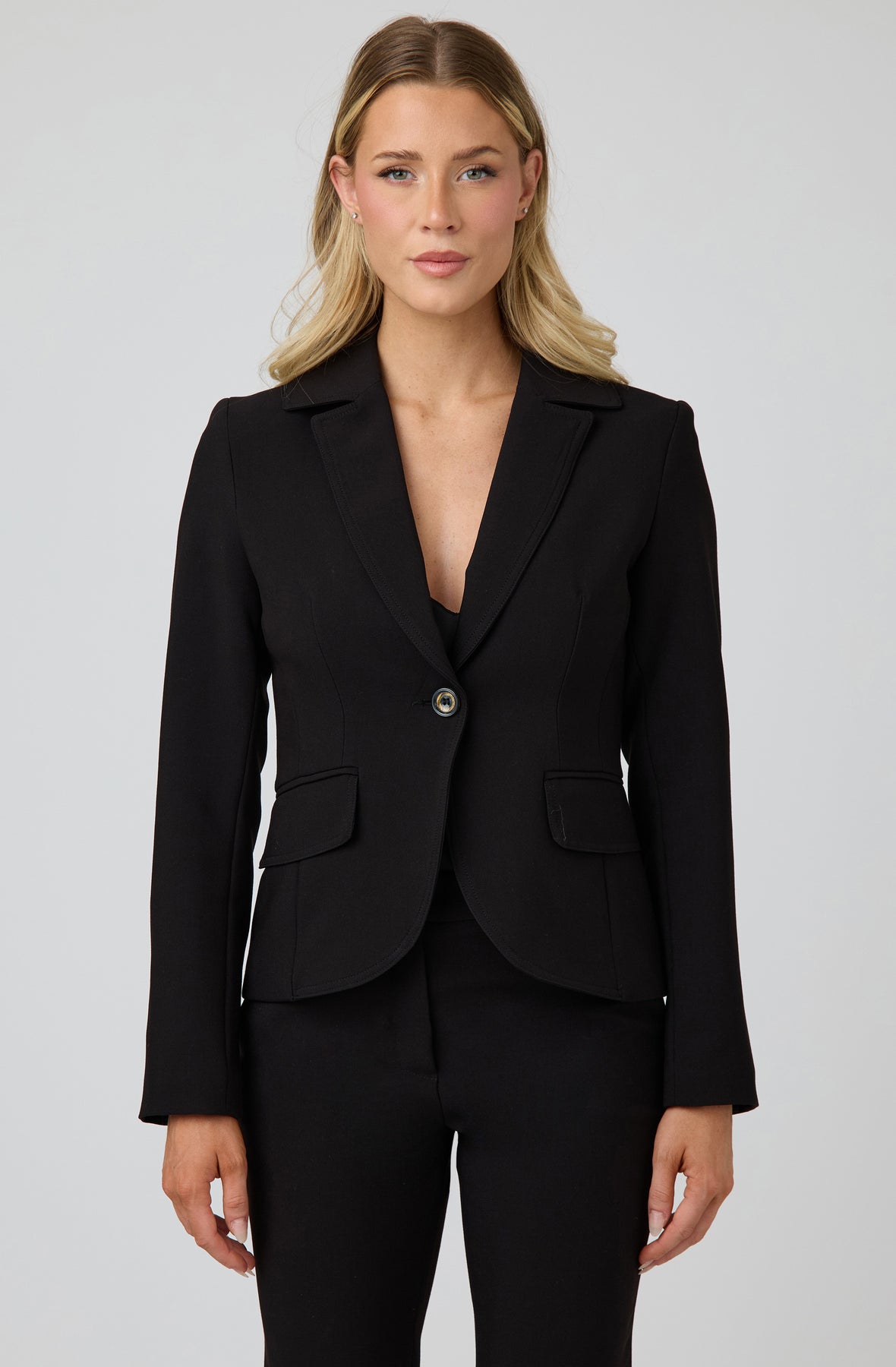 A refined classic with a modern edge. This single-breasted long-sleeve fitted jacket features a structured, flattering silhouette, double-stitched lapels, tortoiseshell button, button cuffs, and flap pockets for timeless sophistication. Fully lined for comfort and durability, it transitions effortlessly from office to evening.