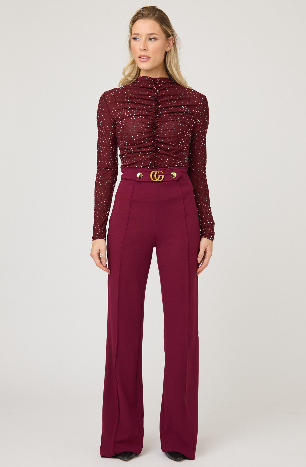 This is an elevated high-rise wide-leg pants crafted from stretch fabric and features a Gold Front Buckle that slims the waist. These chic pants look great paired with a sleek jacket or a classic top.