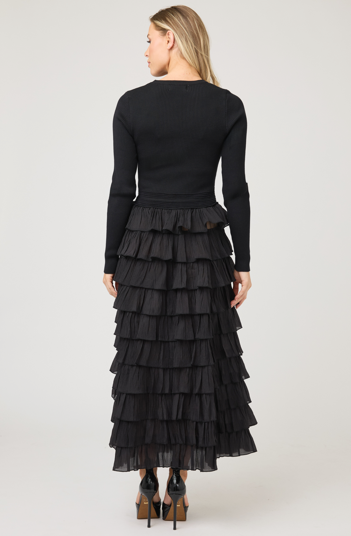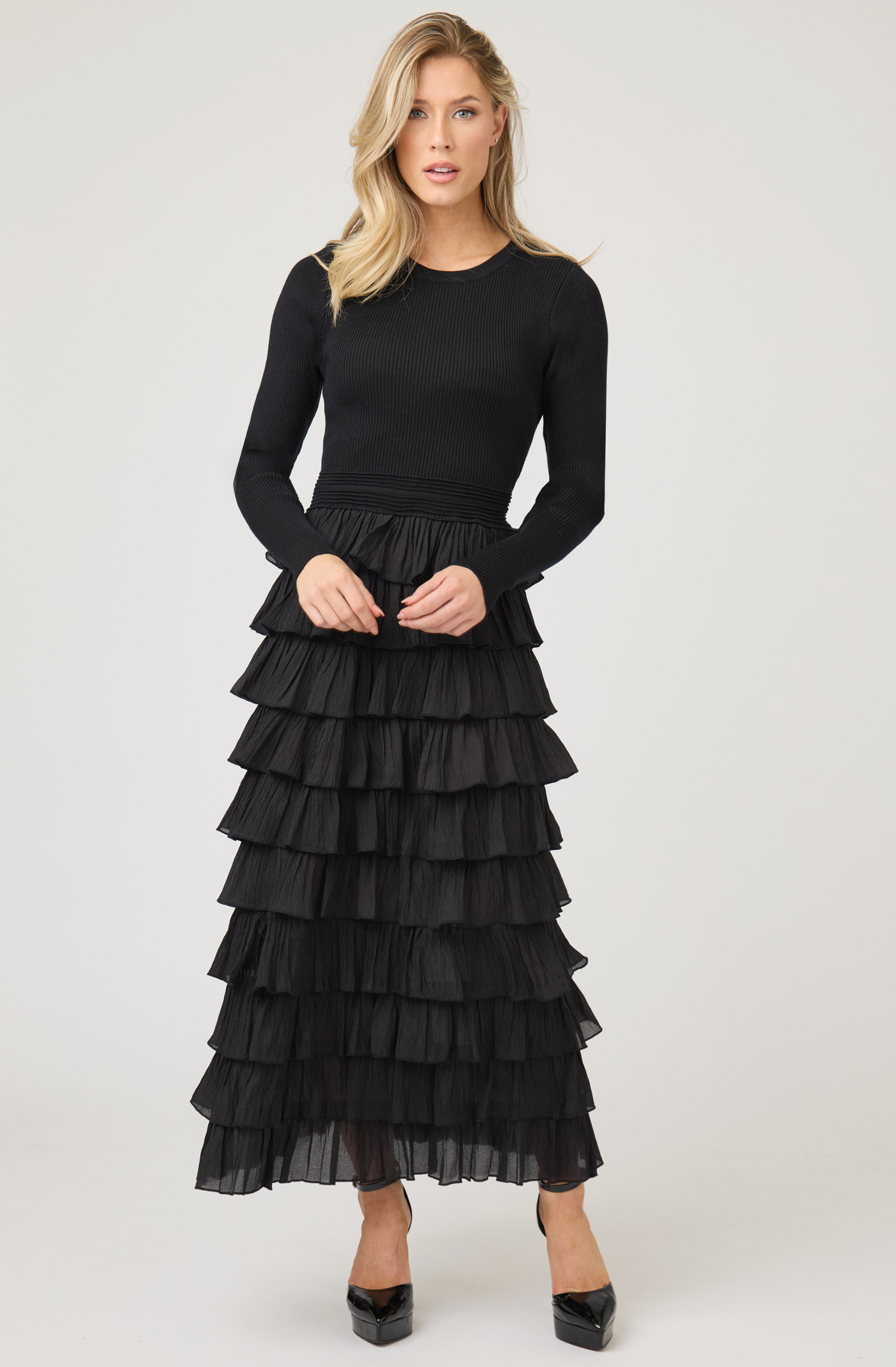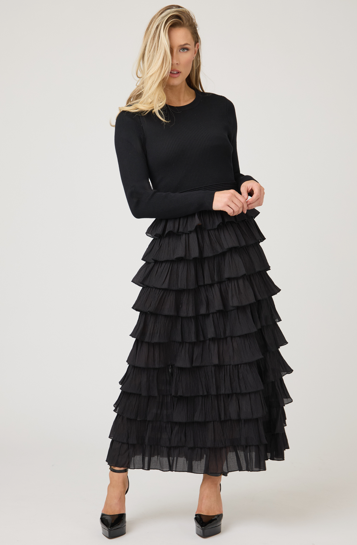 A show-stopping blend of texture and movement, this long-sleeve knit dress features a fitted ribbed bodice that flows into a dramatic tiered ruffle skirt. The contrast between the sleek top and voluminous layered bottom creates a striking, feminine silhouette perfect for evening events or special occasions. Crafted from a refined blend of 68% viscose and 32% polyester, the dress offers both comfort and structure while maintaining its graceful flow. Pair with heeled boots or strappy sandals for an unforgettable look.