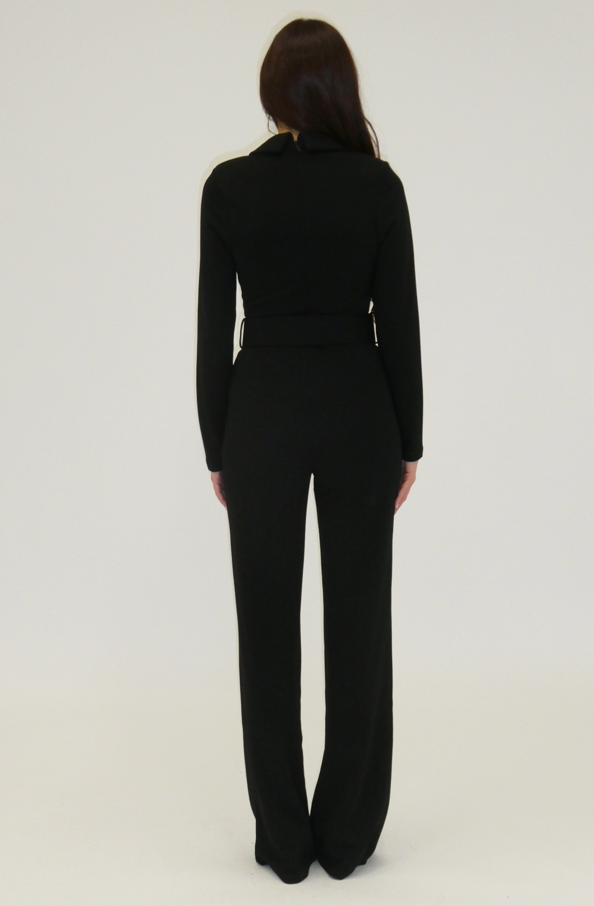 Sleek, confident, and impeccably tailored, this tailored jumpsuit delivers a modern look. Designed with a structured lapel neckline and a flattering fitted waist, it creates a streamlined silhouette that elongates the body while maintaining effortless ease. Subtle seam detailing enhances the tailored look, while the removable gold buckle belt adds versatility and definition. Ideal for evenings, events, or elevated daywear, this jumpsuit transitions seamlessly from statement piece to refined essential.