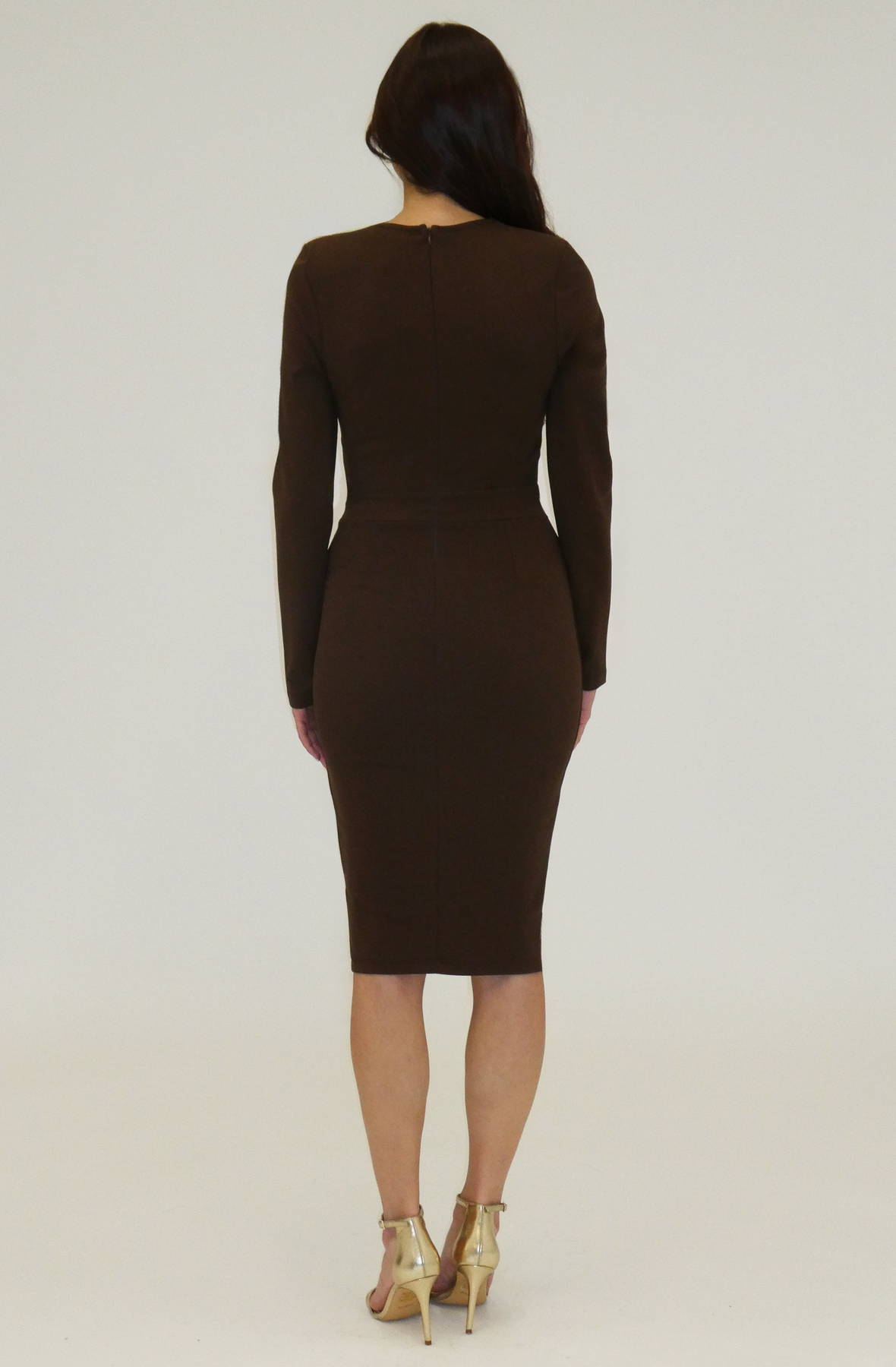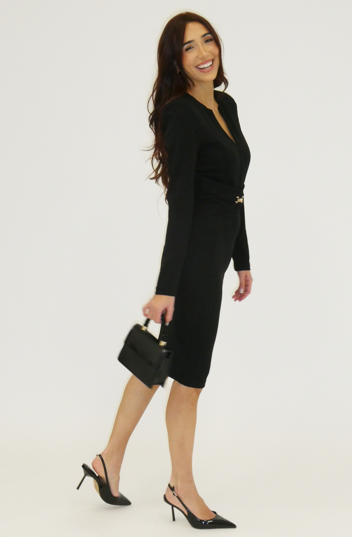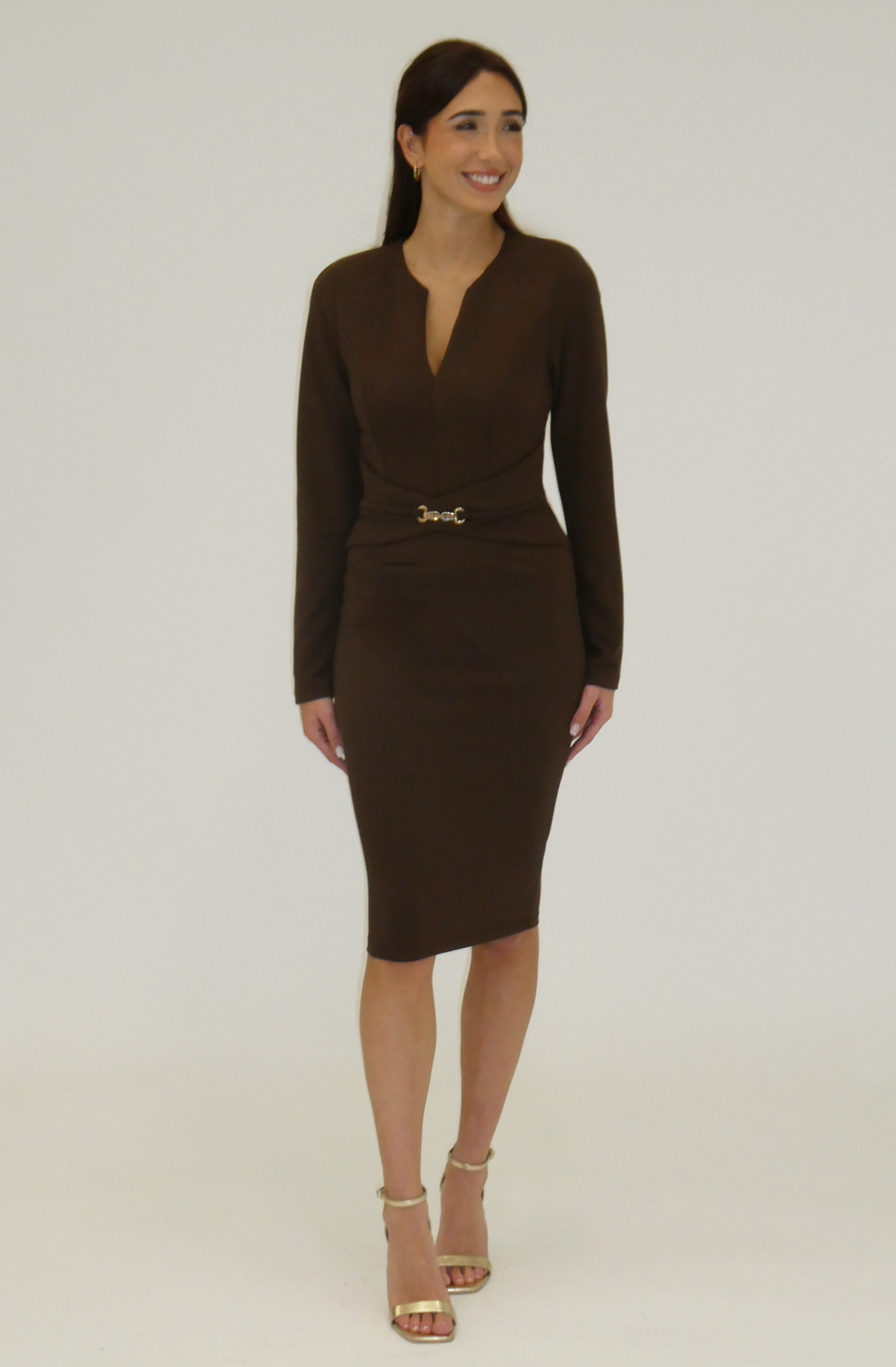 Refined and timeless, this long-sleeve midi dress is designed with a sculpted silhouette that flatters effortlessly. Featuring a clean V-neckline and subtle seam detailing, the look is softly cinched at the waist with a delicate gold-tone chain trim that adds just the right amount of polish. The smooth, streamlined skirt balances the fitted bodice, creating an elegant shape suitable for both formal occasions and elevated evenings. A modern essential with thoughtful detailing, this dress delivers understated sophistication.