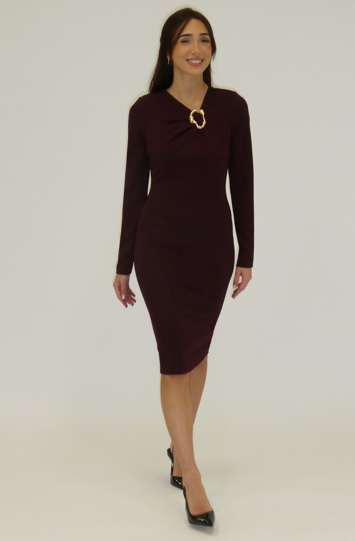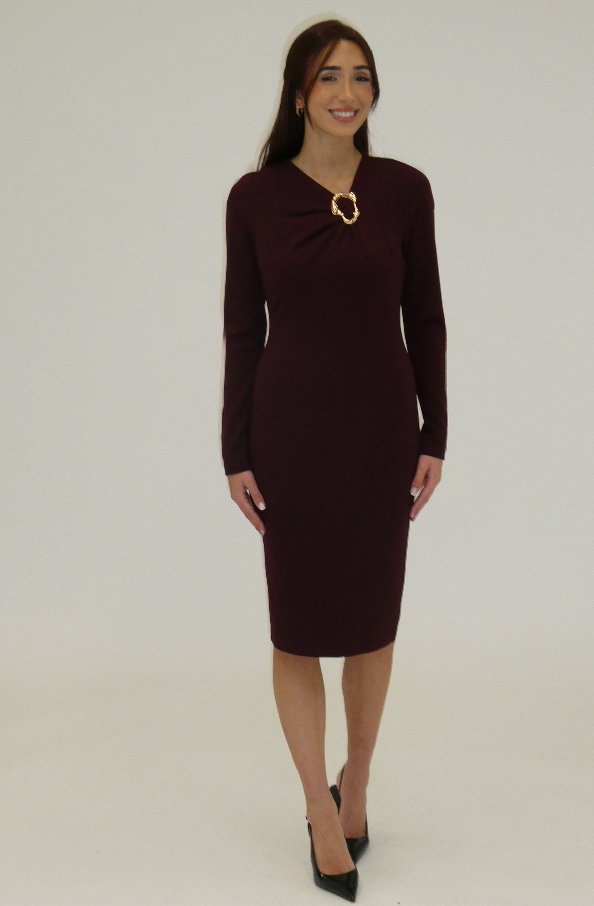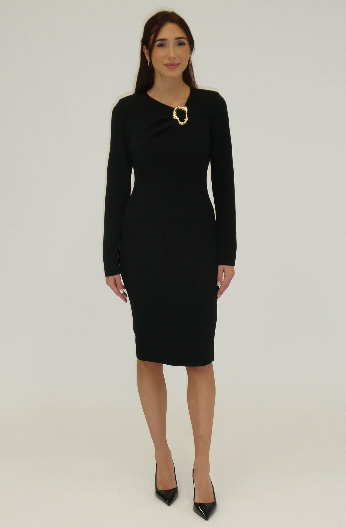 Clean lines meet sculptural detailing in this modern long-sleeve sheath dress. Designed with a flattering V-neckline, the silhouette is softly gathered and anchored by a statement gold-tone hardware accent at the bodice, creating subtle dimension and visual interest. Tailored seams enhance the streamlined fit, while the smooth skirt maintains an elegant, uninterrupted line. Sophisticated yet contemporary, this dress is ideal for evening occasions, events, or elevated dinners where refined detail makes the difference.