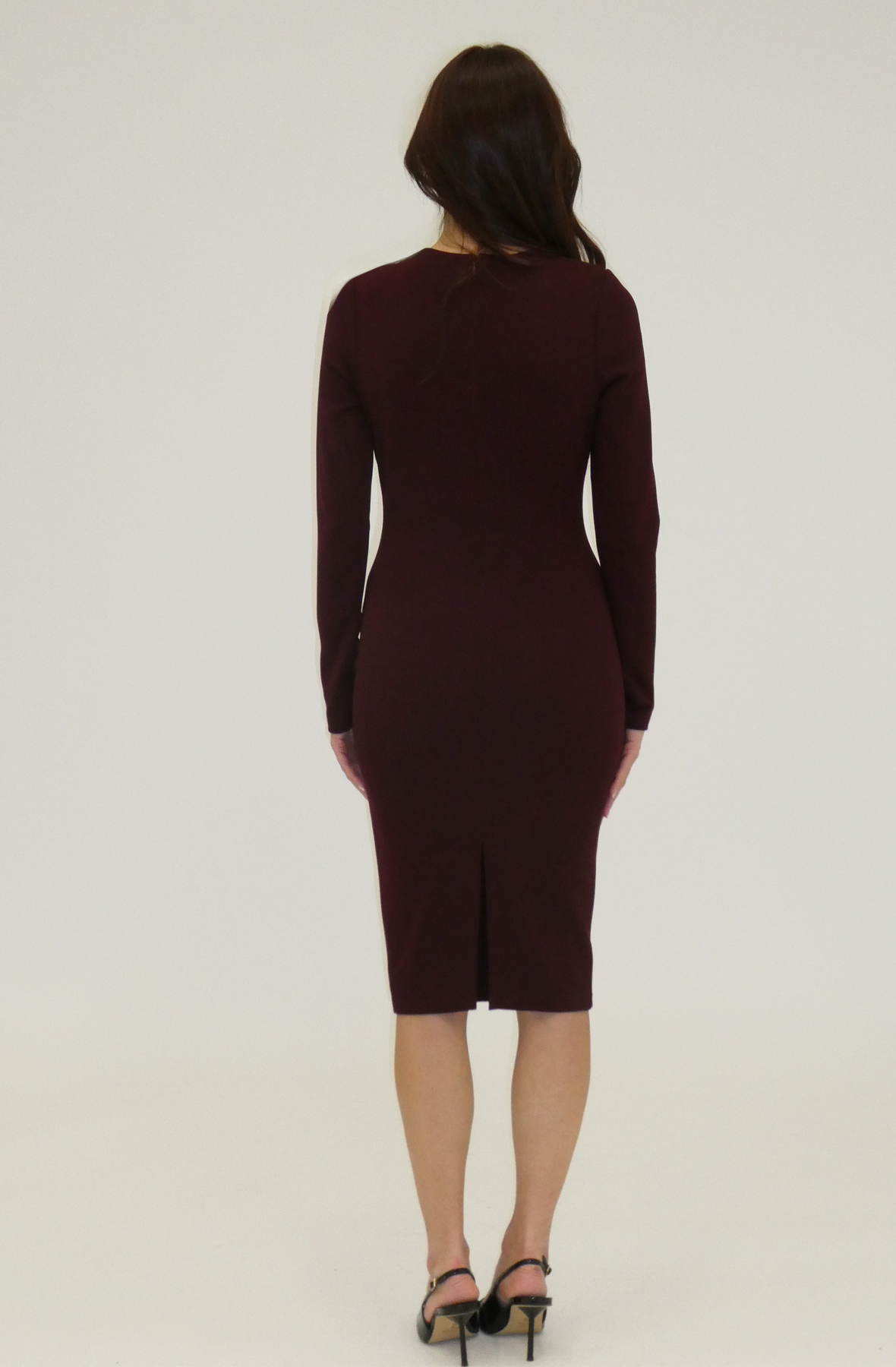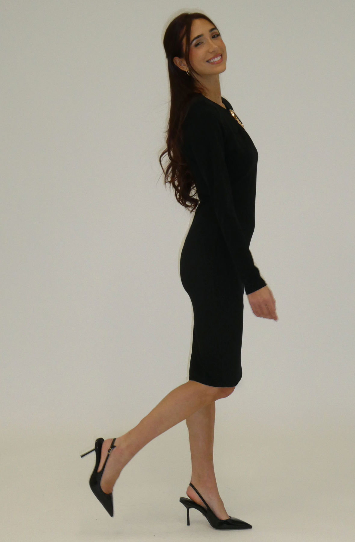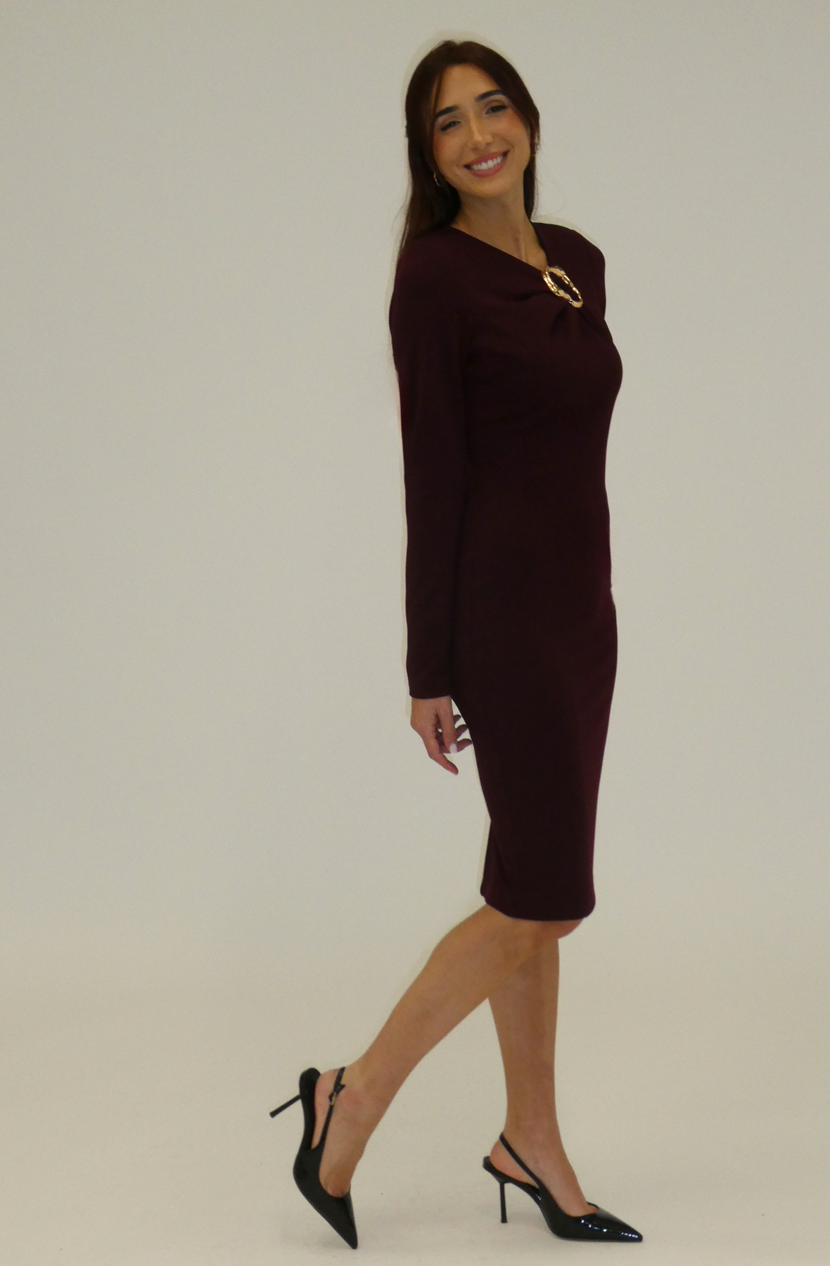 Clean lines meet sculptural detailing in this modern long-sleeve sheath dress. Designed with a flattering V-neckline, the silhouette is softly gathered and anchored by a statement gold-tone hardware accent at the bodice, creating subtle dimension and visual interest. Tailored seams enhance the streamlined fit, while the smooth skirt maintains an elegant, uninterrupted line. Sophisticated yet contemporary, this dress is ideal for evening occasions, events, or elevated dinners where refined detail makes the difference.