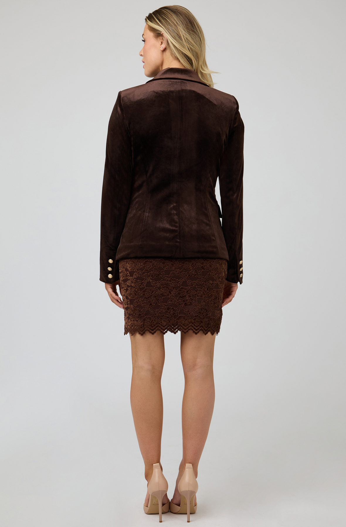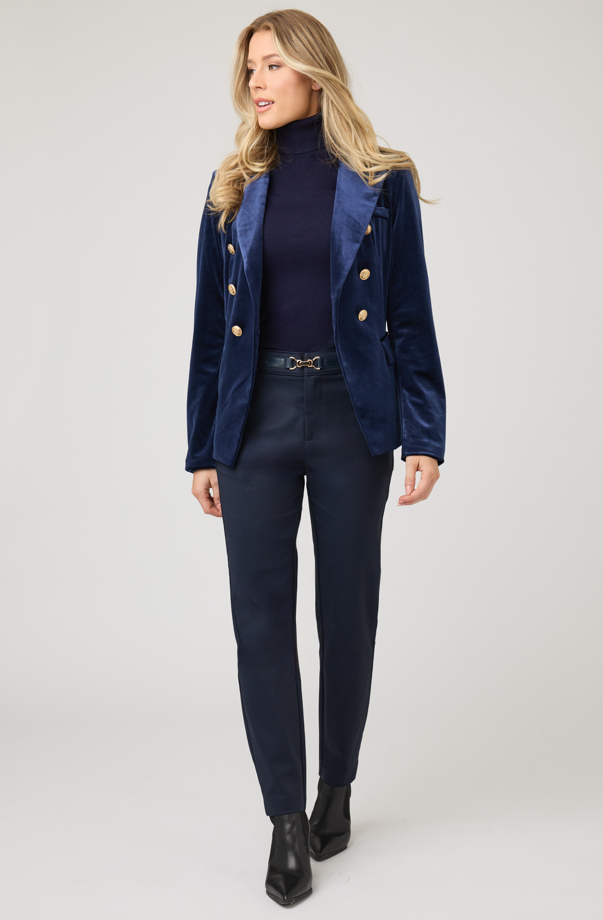This classic velvet jacket with sharp shoulders will add a touch of elegance to your wardrobe. The double-breasted buttons front and angular lapel makes this a timeless classic in your closet.
