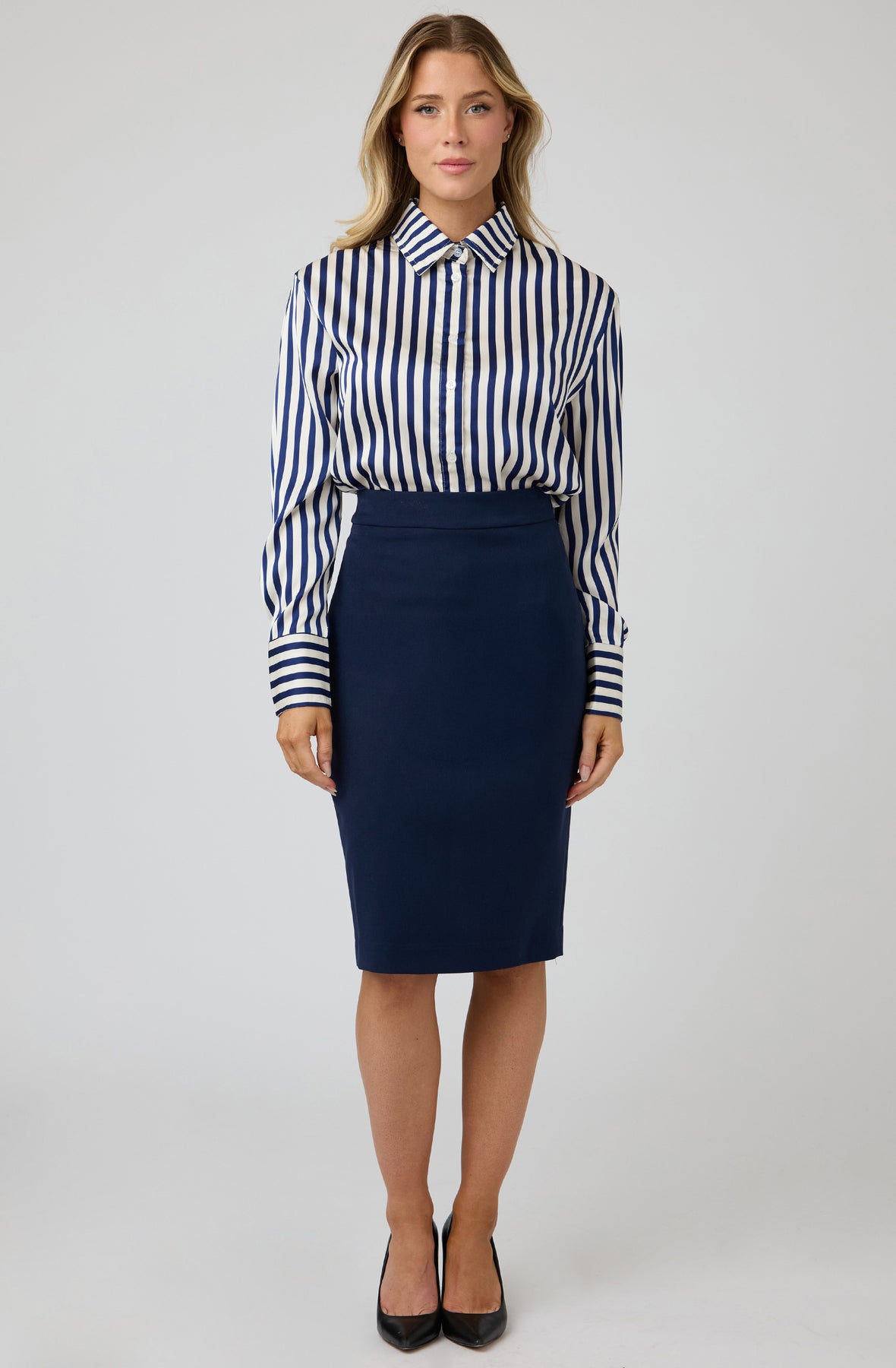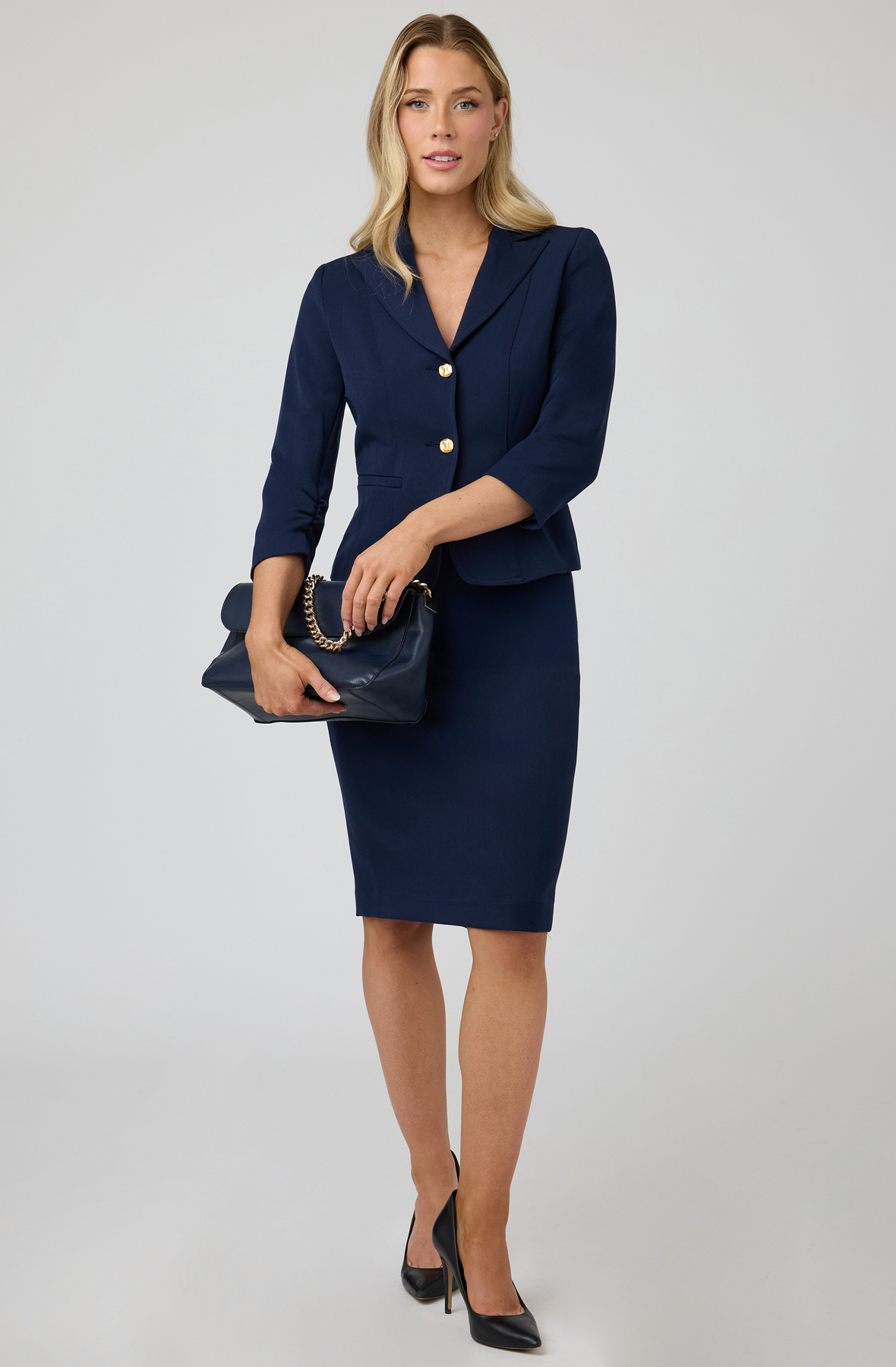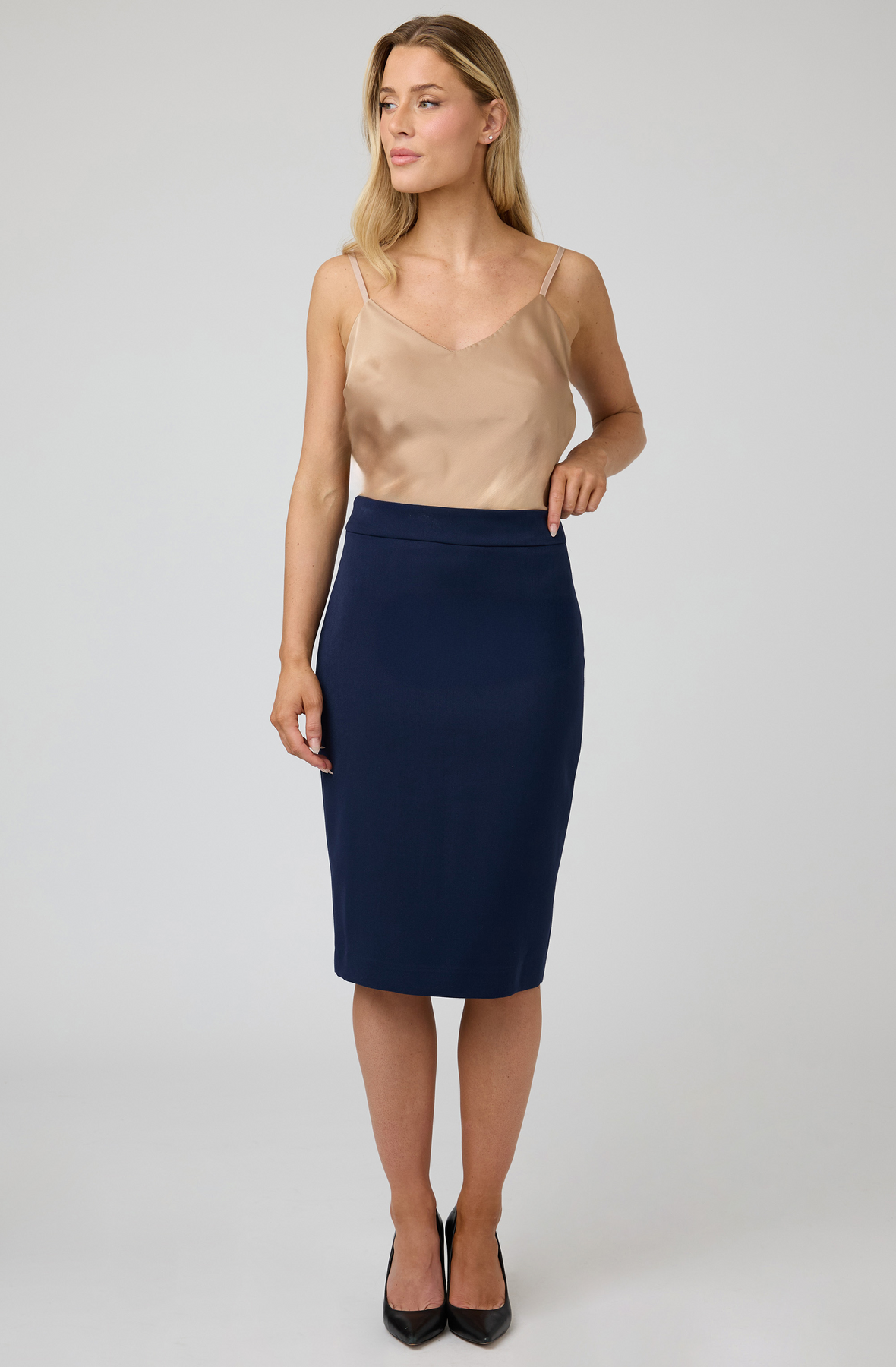 Elegant and refined, this just-below-the-knee pencil skirt offers a smooth, structured silhouette that flatters every figure. Designed with a clean waistband and precise seaming, it delivers timeless sophistication and all-day comfort. Perfectly paired with matching jackets or blouses for a polished, modern look.