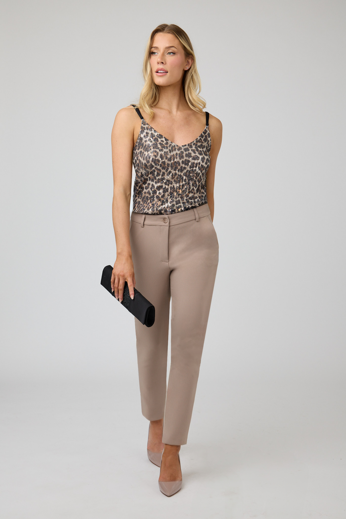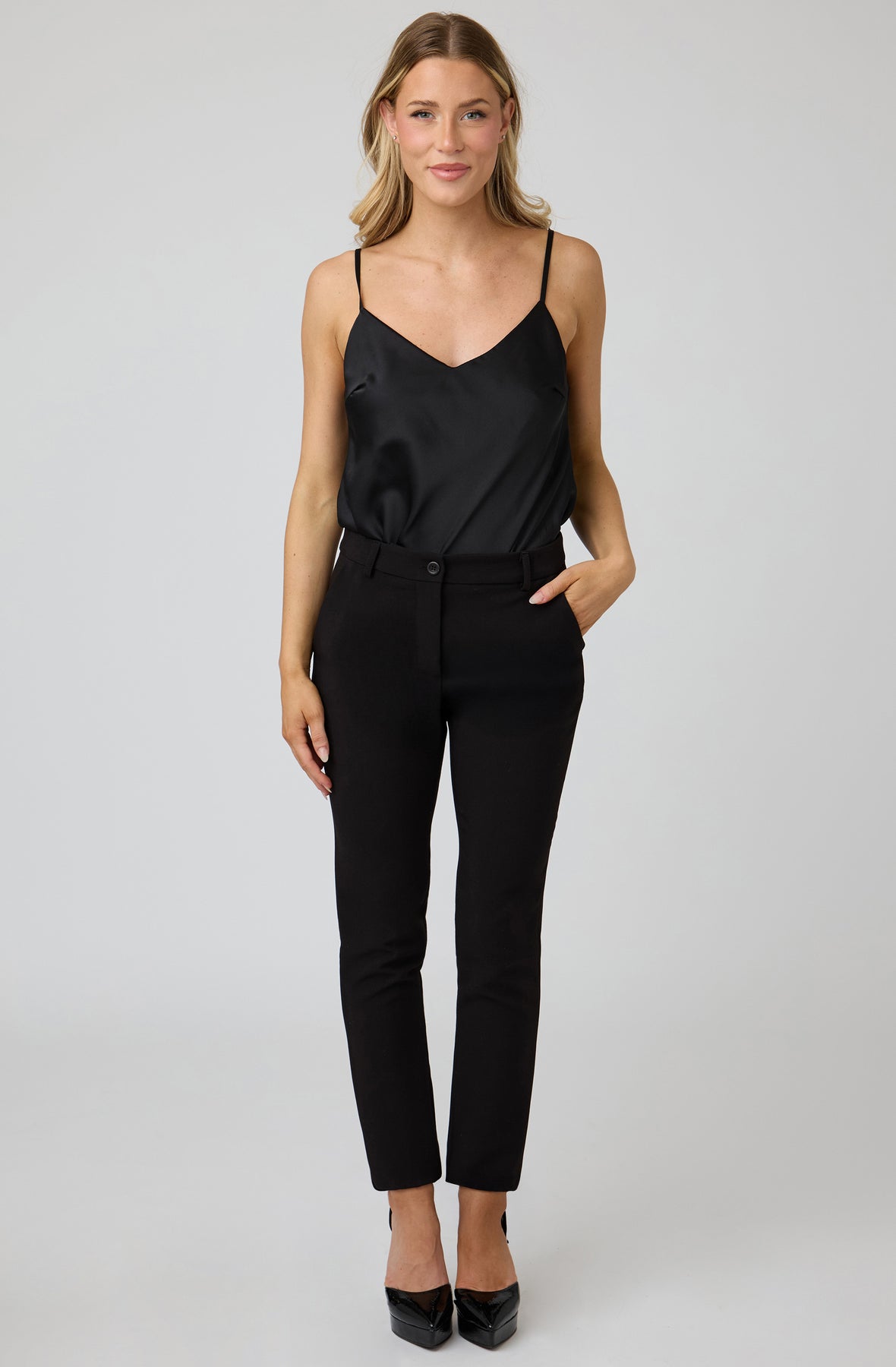 Un pantalon classique longueur cheville, doté d'une ceinture, de poches latérales et d'une fente discrète à l'ourlet. Sa coupe slim confortable et sa confection élégante en font un vêtement polyvalent par excellence, idéal du bureau aux soirées.