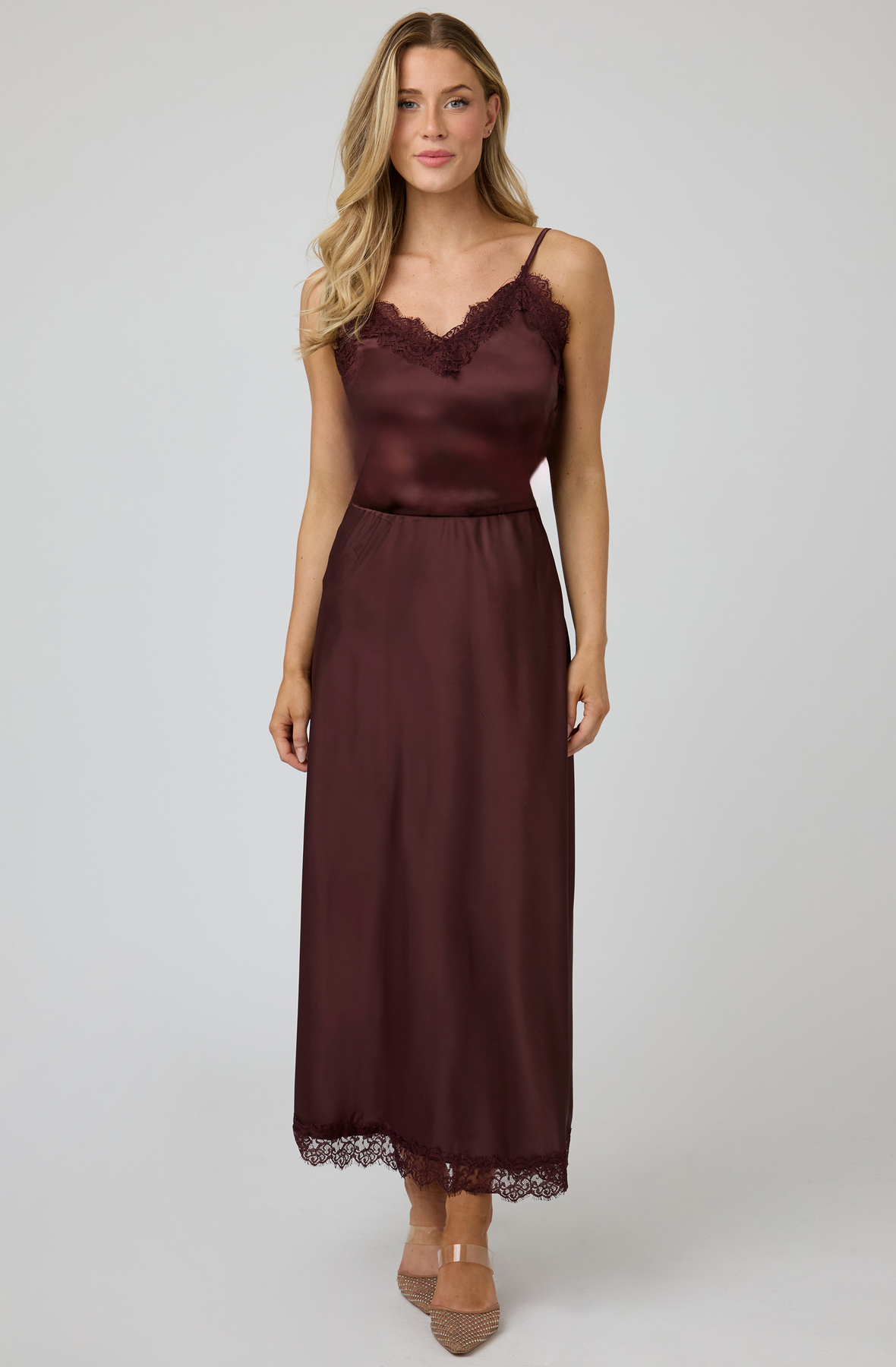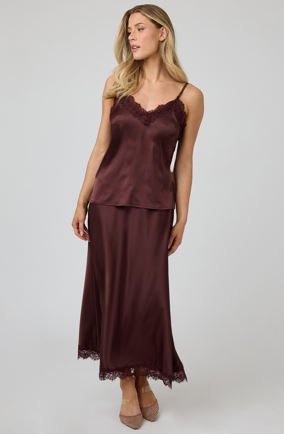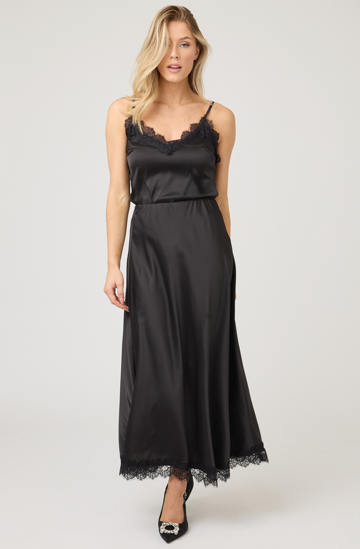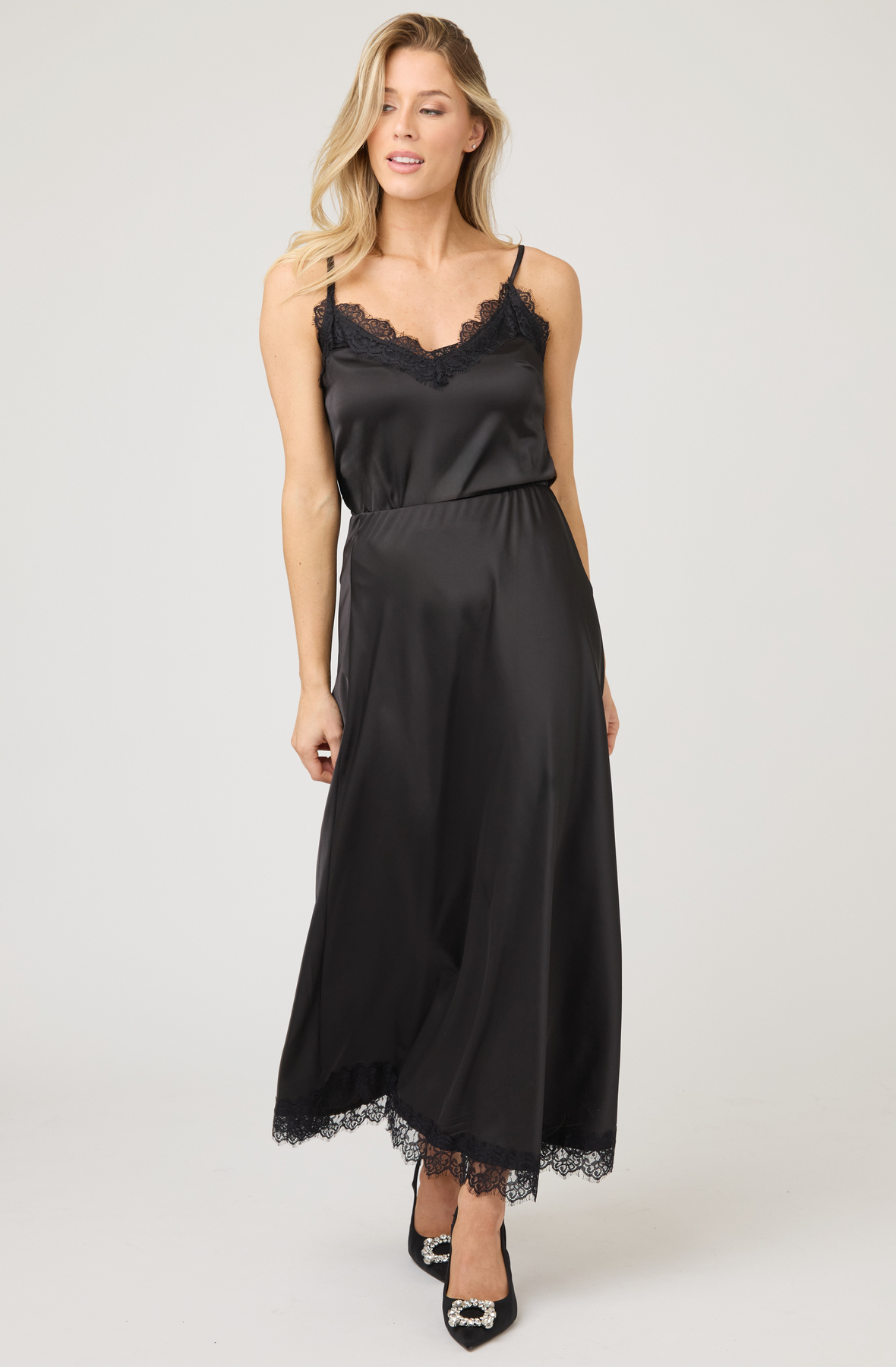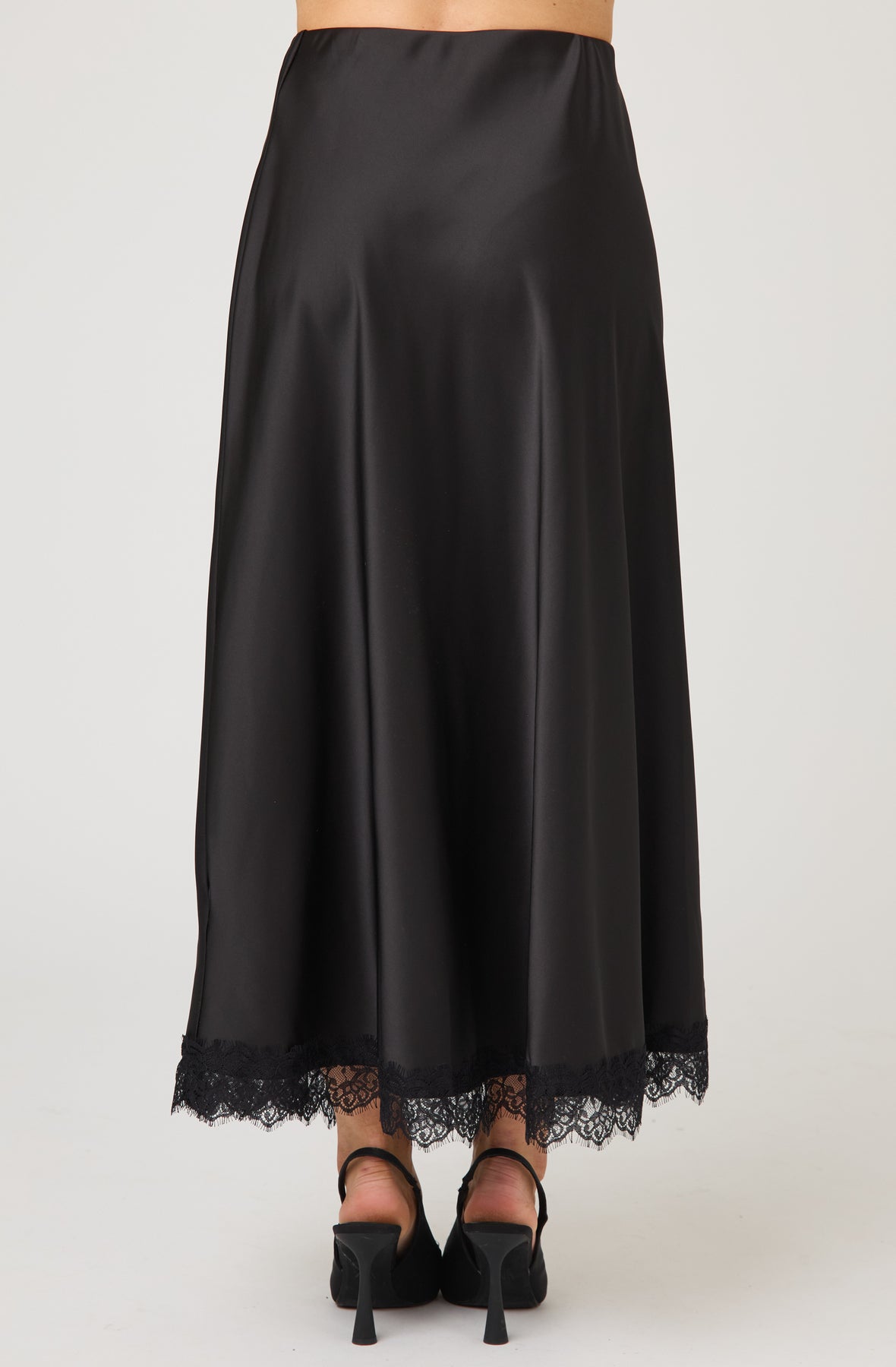 Cette jupe longue en satin présente une coupe trapèze fluide et une délicate bordure en dentelle à l'ourlet pour une finition élégante. Confectionnée dans un mélange de satin fluide légèrement extensible, elle s'accorde facilement avec un débardeur, un chemisier en satin ou un blazer structuré. Portez-la avec un pull décontracté pour un contraste moderne et tendance. Une pièce polyvalente et intemporelle, idéale en toute saison.