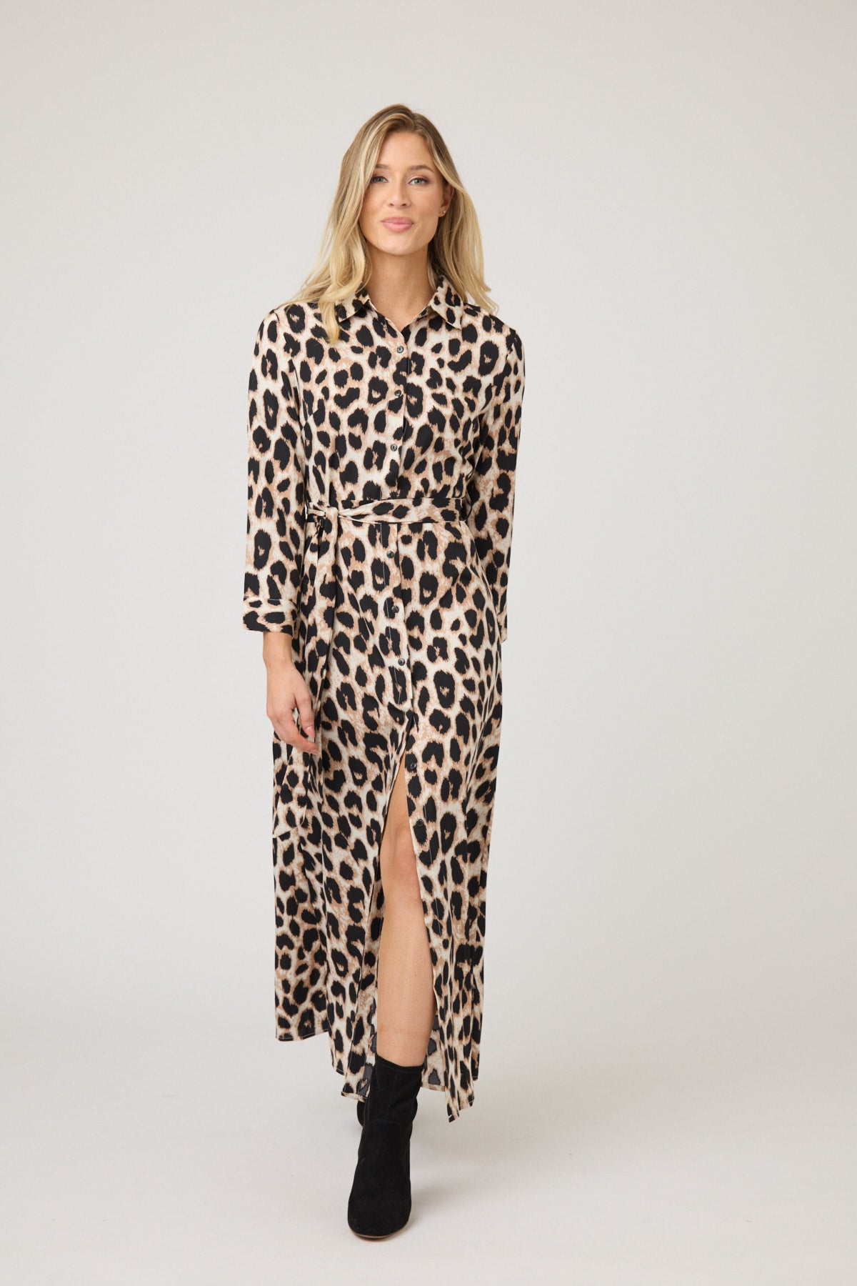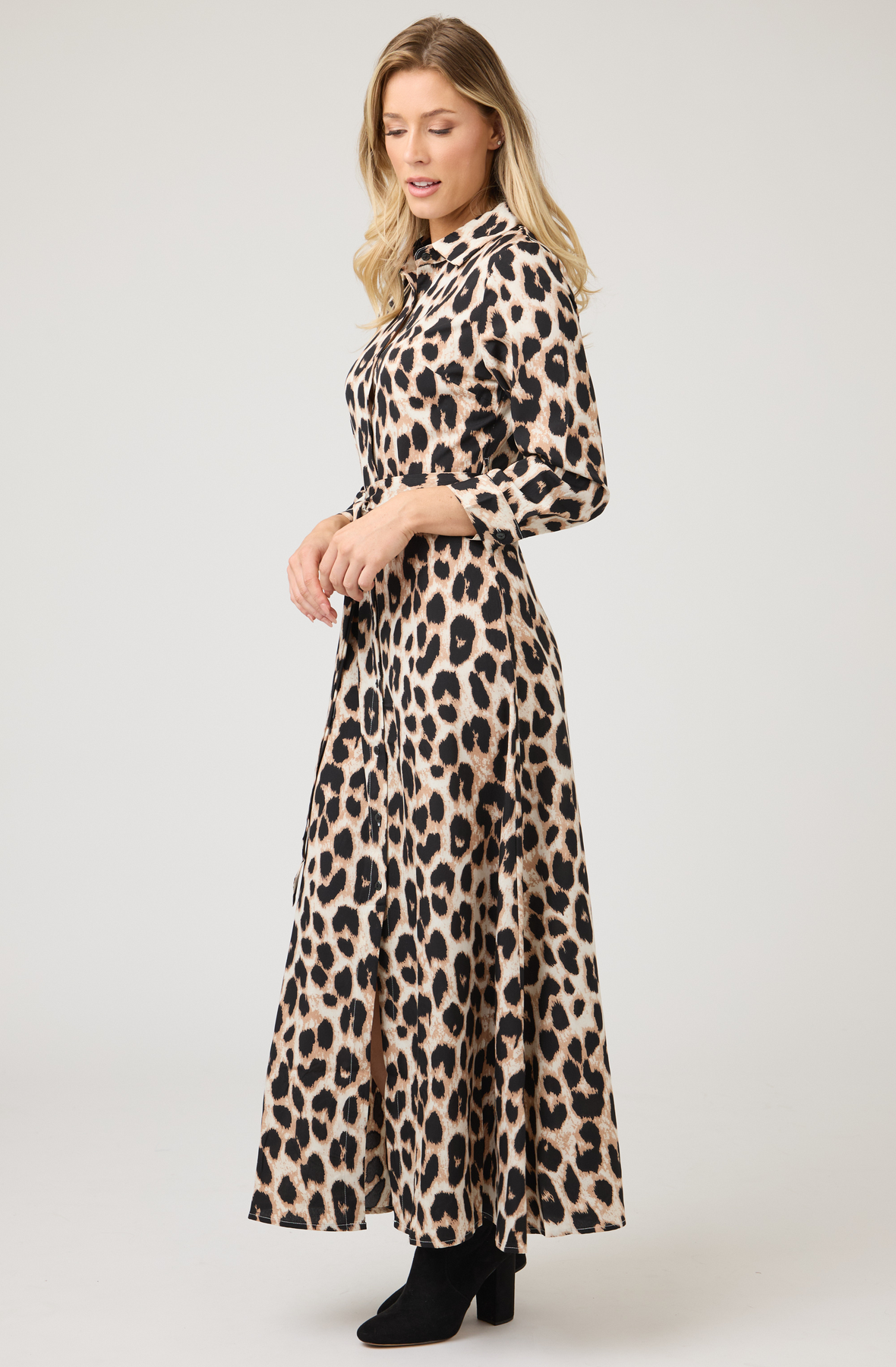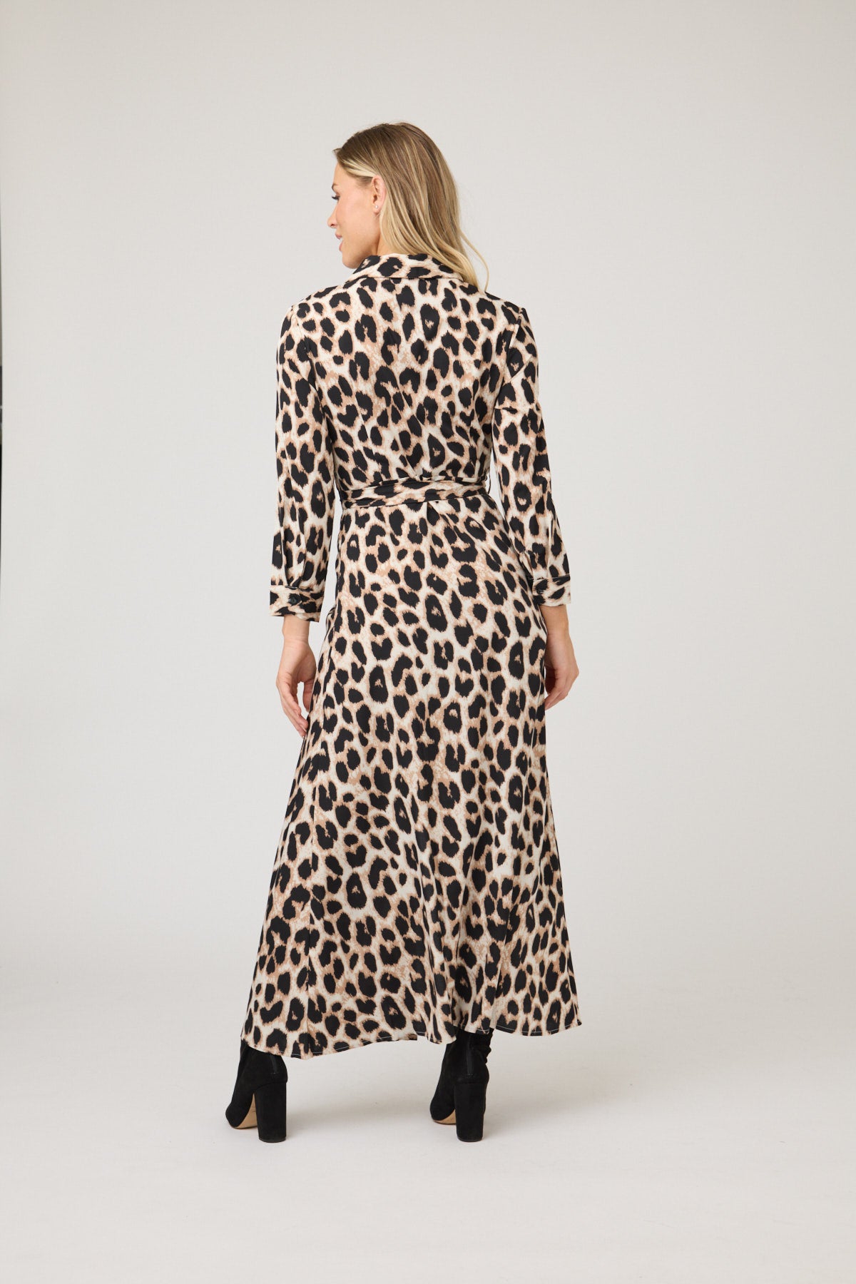 À la fois audacieuse et raffinée, cette robe longue en soie à imprimé léopard présente un col chemise classique, une fermeture boutonnée sur le devant et une ceinture à la taille pour une silhouette féminine et flatteuse. Grâce à son drapé fluide et sa grande polyvalence, elle se prête aussi bien au travail qu'aux sorties du week-end.