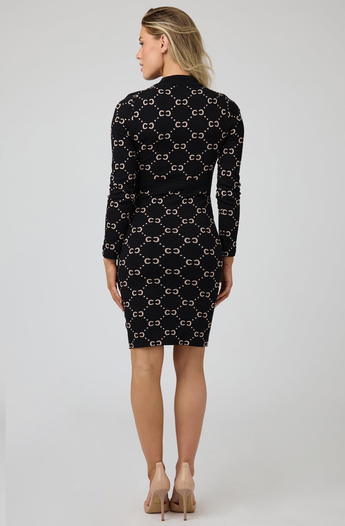 Sophistiquée et affirmée, cette robe midi en maille monogrammée arbore un motif géométrique raffiné noir et beige, rehaussé de boutons dorés sur le devant. Sa taille structurée et sa coupe cintrée sculptent une silhouette élégante et flatteuse, idéale pour les réunions professionnelles ou les soirées. Confectionnée dans un luxueux mélange de maille composé à 85 % de viscose et à 15 % de nylon, elle allie douceur et légère élasticité pour un confort optimal et un style impeccable tout au long de la journée. Portez-la avec des escarpins et une pochette élégante pour une allure sophistiquée et affirmée.