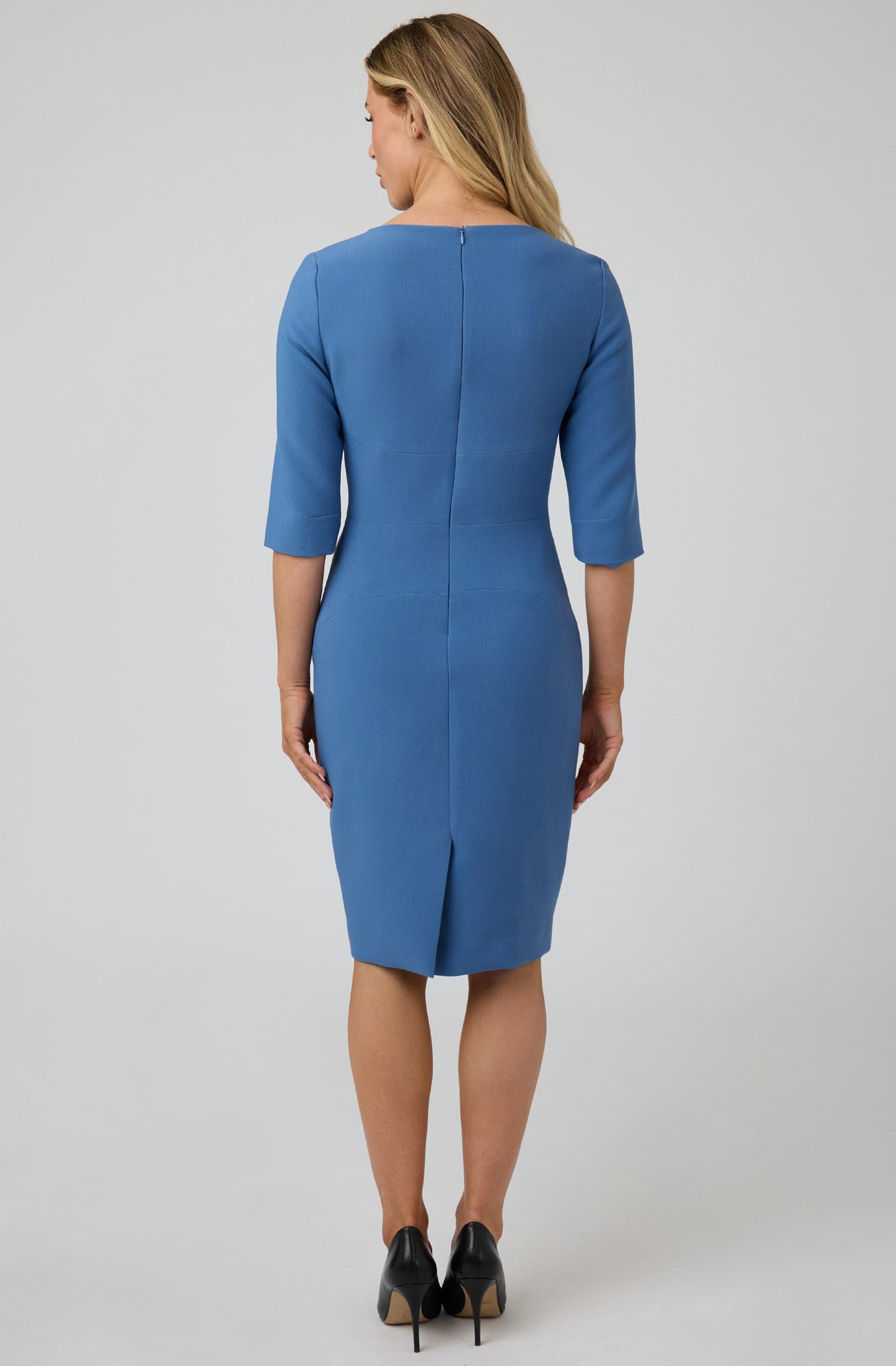 Élégante et raffinée, cette robe arrivant juste sous le genou présente des manches trois-quarts, un nœud à l'encolure et des coutures qui soulignent la silhouette. Grâce à sa coupe épurée et à ses finitions impeccables, elle se porte aussi bien au bureau qu'en soirée.